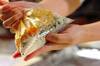 トースターにアルミホイルを敷き、(3)をのせオリーブ油を全体にかけ6~7分焼き、サラダ菜と一緒に盛る。