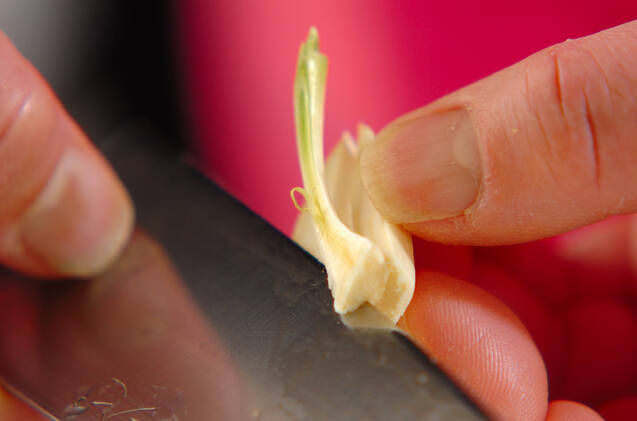 <鶏つくね>の細ネギは小口切り、ニンニクは半分に切って芽の部分を取り、みじん切りにする。ショウガはすりおろす。
