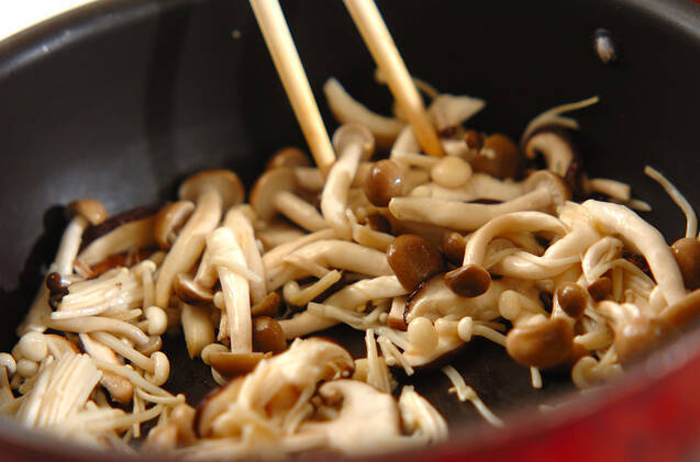 フライパンにシメジ、エノキ、シイタケを入れて中火にかけ、フライパンが熱くなってきたら<炒め調味料>の材料を加え、全体にしんなりするまで炒める。