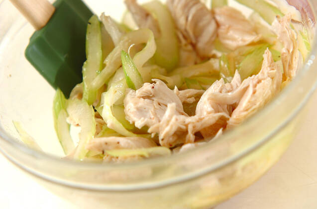 <調味料>のボウルに鶏ささ身とセロリを入れ、和える。器に盛り、白ゴマを振る。
