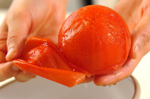 トマトはヘタをくり抜き熱湯に入れ、皮が破れれば冷水に取る。皮をむいて水気を拭き取り、6~8つのくし切りにする。