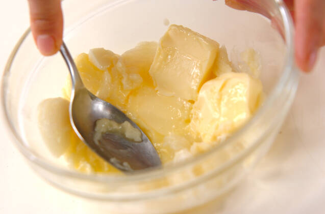 <アンチョビバター>を作る。バターにニンニクをつぶす様によく混ぜ合わせ、アンチョビを加えてよく混ぜる。