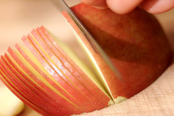 <B>のリンゴはよく洗って芯を取り、皮ごと薄くスライスする。レーズンは刻み、ラム酒を加える。