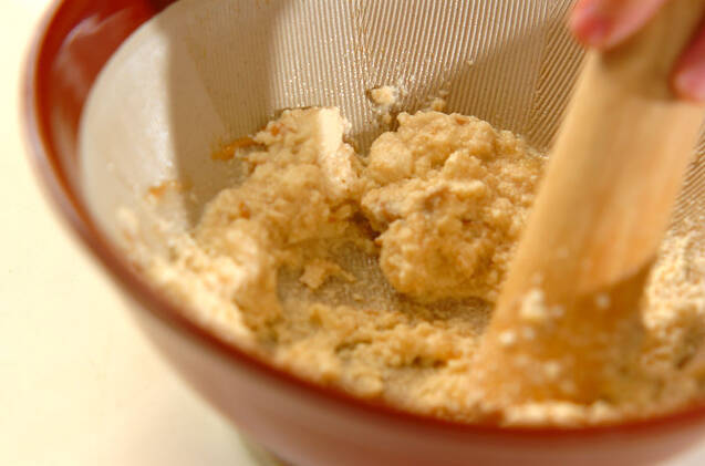 <和え衣>の材料をすり鉢に入れ、すりこ木でよくすり混ぜ、よく冷やしておく。