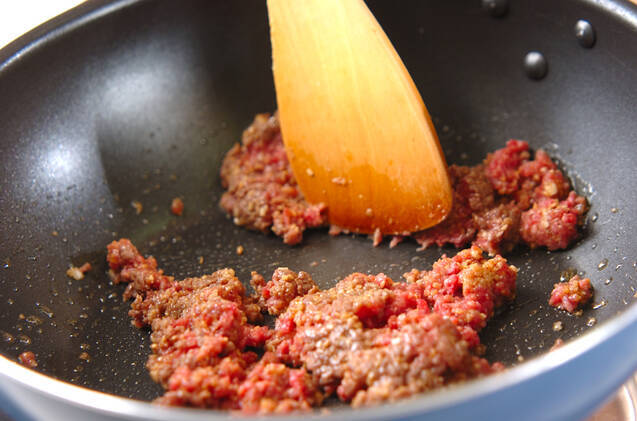 中華鍋にゴマ油大さじ1を強火で熱し、牛ひき肉を炒めていったん取り出す。