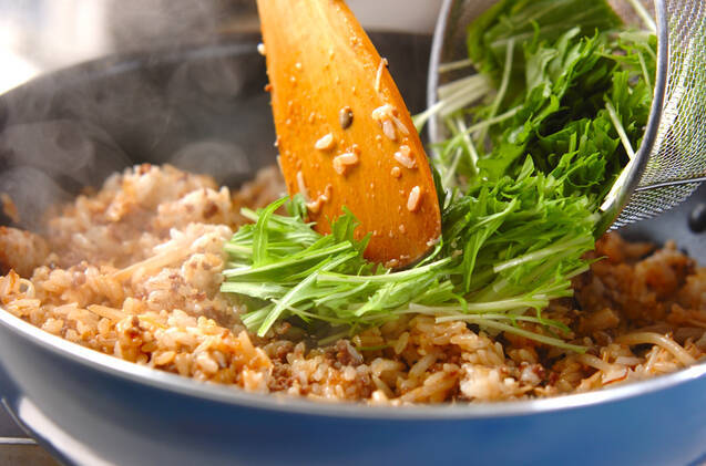 体に炒め合わせられたら(1)と<調味料>を加えてよく混ぜ合わせ、最後に水菜を加えてザックリ混ざったら、器に盛り分ける。