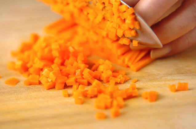 ニンジンは皮をむき、みじん切りにする。鶏ひき肉は水に放って軽くほぐし、ザルに上げる。