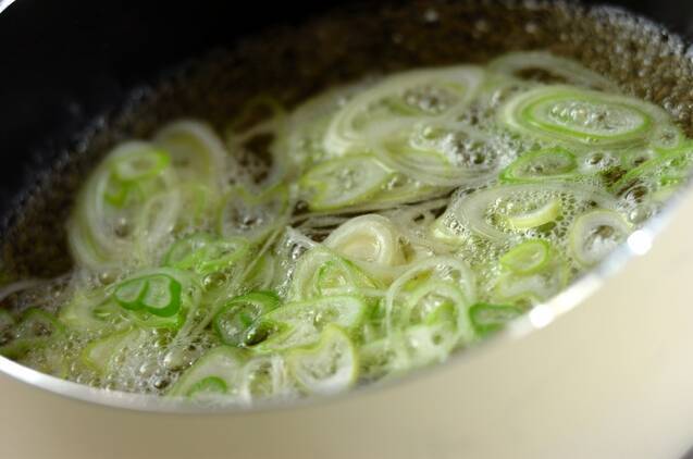 鍋にだし汁、白ネギを入れて中火で熱し、煮たったら火を少し弱める。