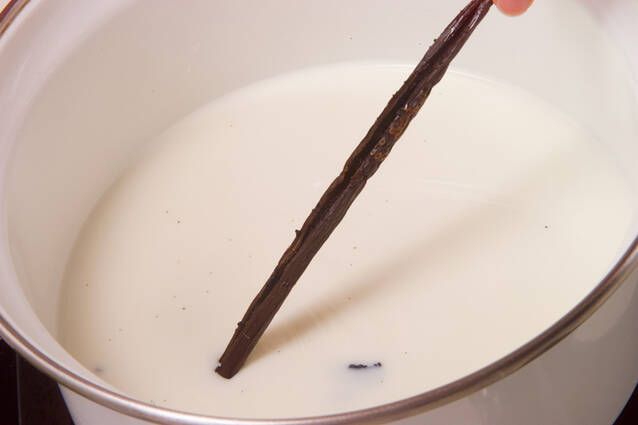 鍋に牛乳、グラニュー糖、練乳、バニラビーンズ、バニラビーンズのサヤを入れて火にかける。沸騰させないように注意しながらグラニュー糖を煮溶かし火を止める。