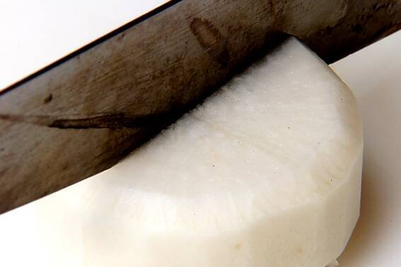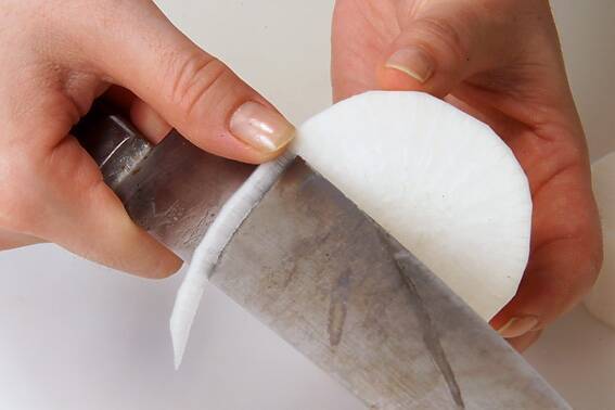 大根は皮を厚めにむいて4~6つの輪切りにし、煮くずれない様に面取りする。火の通りをよくするため、片面に十字に切り込みを入れる。鍋に米のとぎ汁、又は水に大2の米を加え、大根と共に入れて火にかける。煮立てば火を弱め、20分下ゆでする。ゆで上がればやさしく水洗いする。