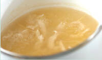 鶏ささ身は筋をひき、細切りにする。鍋にだし汁を入れて中火にかけ、煮たってきたら鶏ささ身、<スープ>の材料を加え4~5分煮る。
