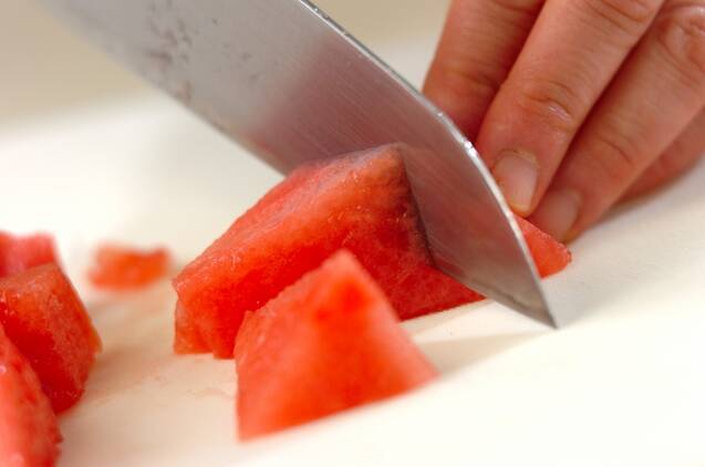スイカは皮と種を取り除き、ザク切りにする。