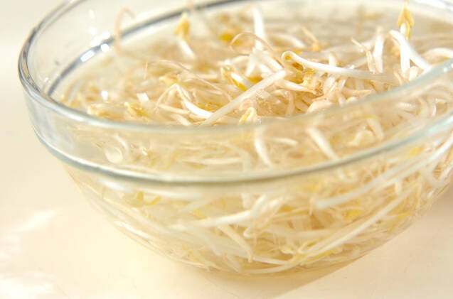 モヤシはたっぷりの水に放ち、パリッとしたらザルに上げ、水気をきる。