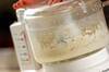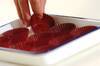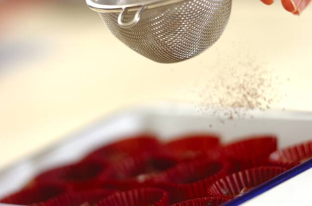 かたまったトリュフチョコレートに茶こしを使いココアパウダーを振る。