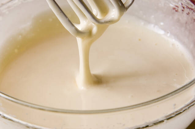 卵は割りほぐし、グラニュー糖、塩を加え、人肌程度に温めながらもったりするまで泡立てる。最後に1~2分、低速でゆっくり混ぜ、泡のキメを細かく整える。