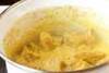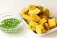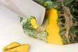 カボチャは種とわたを取り、所々皮を削ぎ落とし、大きめの一口大に切る。