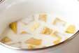 鍋にカボチャ、牛乳、固形ブイヨン、バターを入れて中火にかける。(牛乳の量はカボチャがひたひたにつかる量に加減して下さい。)