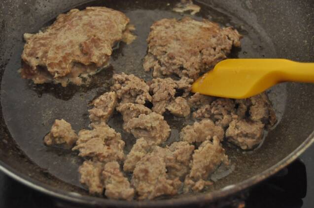 フライパンにオリーブ油を中火で熱し、合いびき肉を2~3等分に広げ、焼き色がついたら返して火を通し、塊が残る程度にポロポロにほぐす。