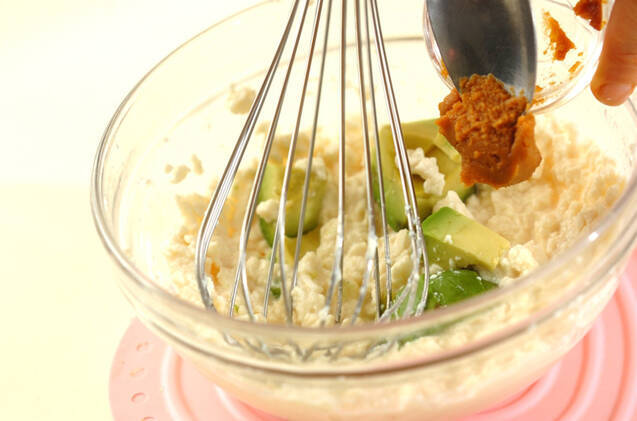 <豆腐みそソース>を作る。ボウルに絹ごし豆腐を入れて泡立て器で混ぜる。少しなめらかになったら、アボカドと合わせみそを加えて混ぜ合わせる。全体に混ざったら、豆乳を少しずつ加えてなめらかになるまで混ぜる。(ヒント)ソースの柔らかさをみながら、豆乳の量を調整して下さいね。