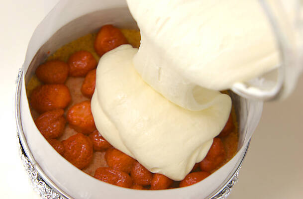 イチゴのコンポートを敷き詰めたケーキの台に、7の生地を流し入れ、170℃に温めたオーブンに入れ、60分湯せん焼きにする。※焼いている間に湯せんのお湯が少なくなった場合は途中で少し足して下さい。
