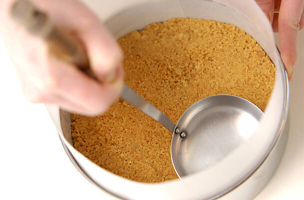 ケーキの台を作る。ビスケットはビニール袋に入れて細かく砕く。耐熱容器にバターを入れ、電子レンジで1分~1.5分加熱して溶かし、ビスケットと混ぜ合わせる。型に敷き、スプーンやゴムベラ等できっちり押さえ付ける。電子レンジは600Wを使用しています。