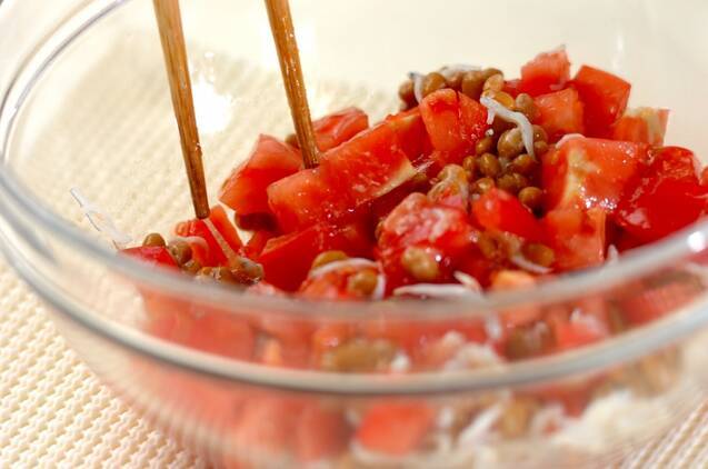 鍋にお湯を沸かし、素麺をゆでる。流水でよく洗い、水気をきって1人分ずつ器に盛る。トマトはヘタをくり抜いてさいの目に切り、その他の<トマトダレ>の材料と混ぜ合わせる。
