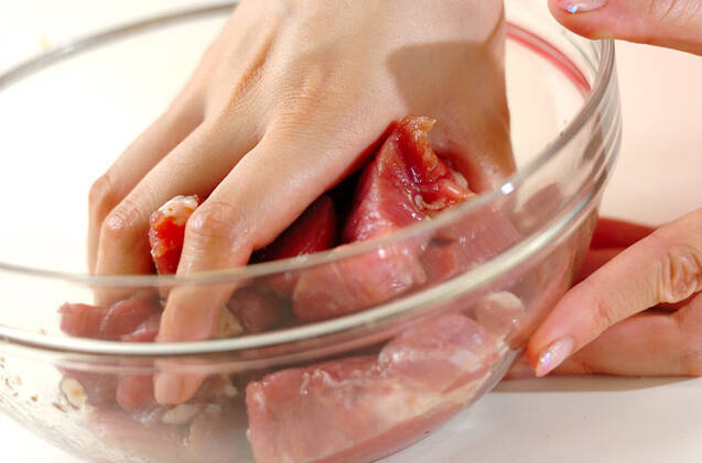豚ヒレ肉は厚さ1.5cmに切ってラップで挟み、肉たたきで軽くたたき、<下味>にからめ、時々返しながら10分おく。