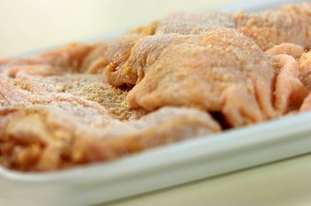 ボウルで<下味>の材料を混ぜ合わせ、鶏もも肉を10分漬け込む。表面に片栗粉をつけてしばらく置く。
