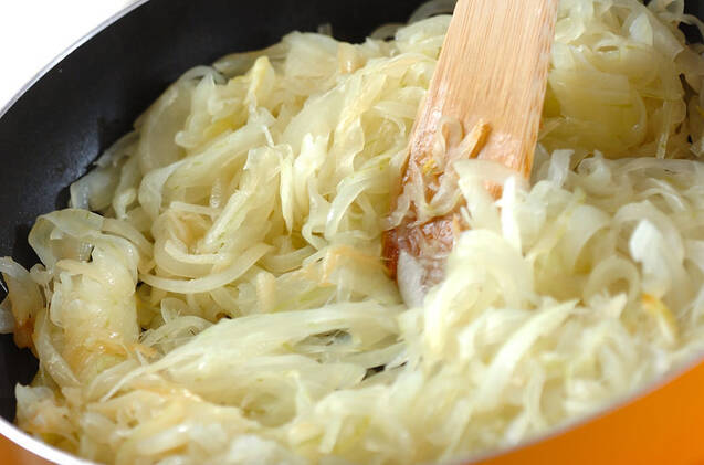 フライパンにサラダ油大さじ1を中火で熱し、玉ネギをしんなりするまで炒める。