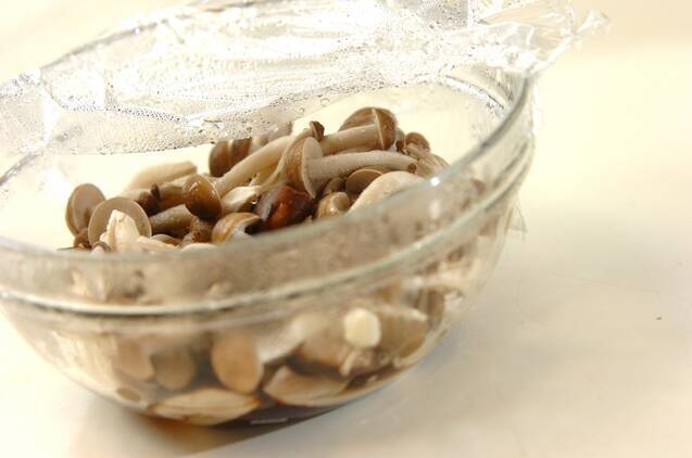 耐熱のボウルにキノコを入れてラップをし、電子レンジで1~2分加熱する。