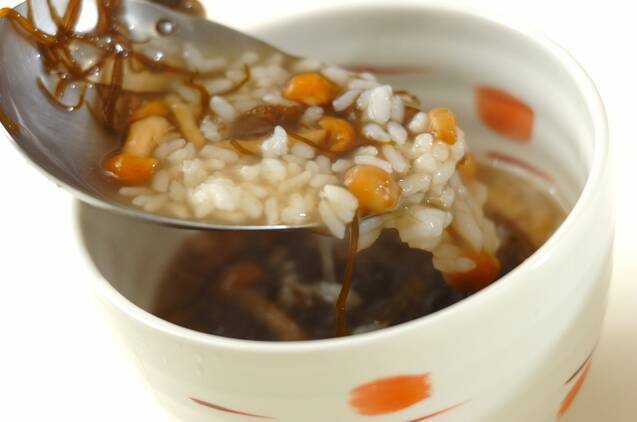 ひと煮たちしたら火を止めて、塩で味を調える。器によそってミツバをのせる。