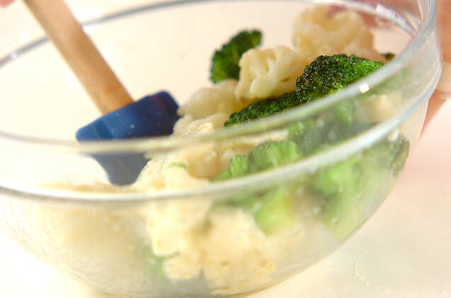 <ドレッシング>のボウルにブロッコリーとカリフラワーを熱いうちに入れ、混ぜ合わせて器に盛る。