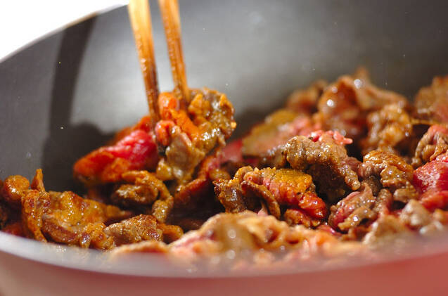 フライパンにサラダ油を中火で熱し、牛肉を白っぽくなるまで炒め、いったん取り出しておく。