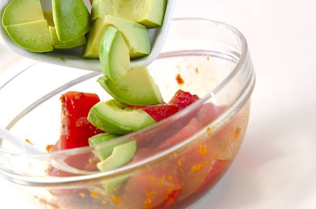 1 マグロに冷えた<タレ>をよく混ぜ合わせ、アボカドも加えザックリ混ぜ合わせる。