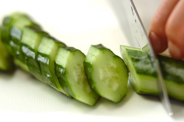 キュウリは両端を少し切り落とし、ピーラーなどで縦じまに皮を所々むき、幅1cmの斜めに切る。