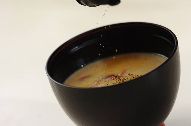煮たったら、みそを溶き入れて塩で味を調え、火を止める。器に入れ、 粗びき黒コショウを振る。