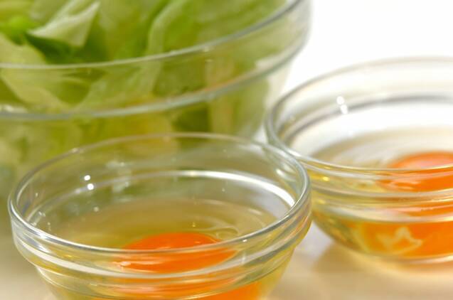 卵は常温にもどし、小皿に1個ずつ割り入れておく。レタスは食べやすい大きさに手でちぎり、水に放って水気をきる。
