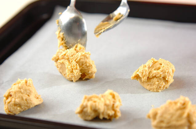 オーブンシートを敷いた天板に(2)の生地をティースプーンで山盛り1杯すくい、間をあけながら並べる。170℃に予熱しておいたオーブンで18~20分焼き、ケーキクーラーにのせて冷ます。