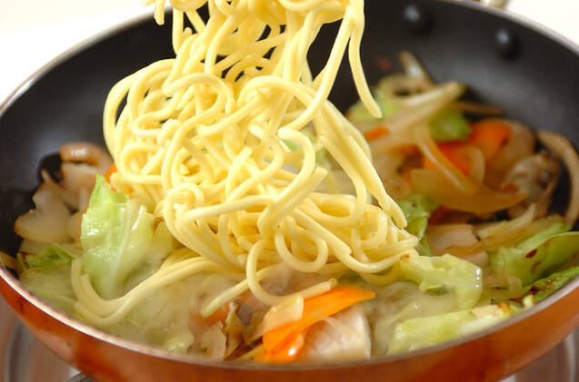フライパンにサラダ油を熱し、キャベツ、玉ネギ、ニンジン、シーフードミックスを炒め合わせ、さらに焼きそば用中華麺を加えて炒め合わせる。