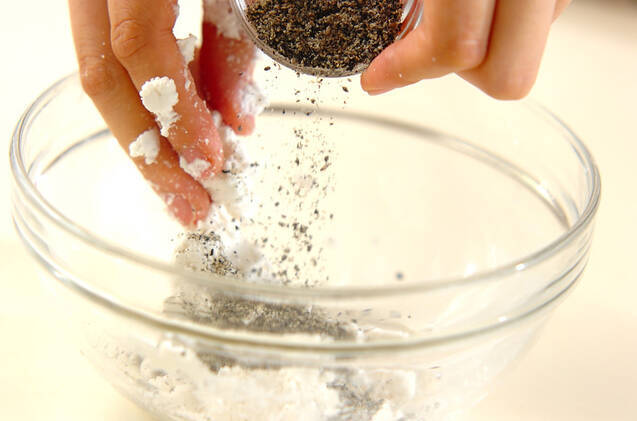 ボウルに白玉粉、砂糖を入れ、水を少しずつ加えながら耳たぶ位の柔らかさに練る。すり黒ゴマを加えてさらに練り、食べやすい大きさに丸める。