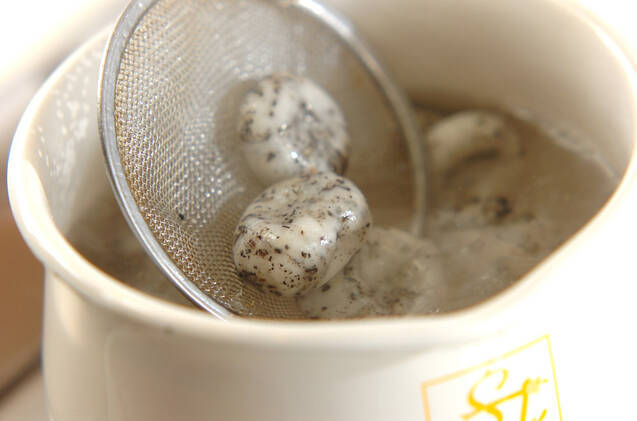 たっぷりの熱湯に(1)を入れ、浮いてきたら1分ゆでて冷水に取り、ザルに上げて水気をきる。器にゆで小豆と盛り合わせ、きな粉をかける。