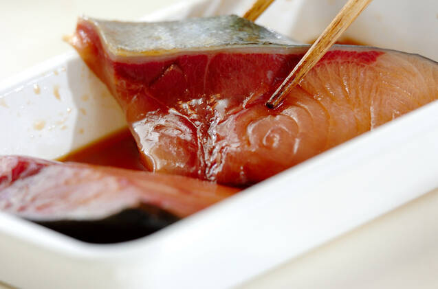 バットに<漬けダレ>の材料を混ぜ合わせ、ブリを時々ひっくり返しながら漬ける。