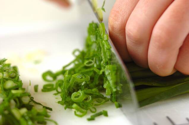 青ネギは根元を切り落とし、小口切りにする。<調味料>の材料を混ぜ合わせる。