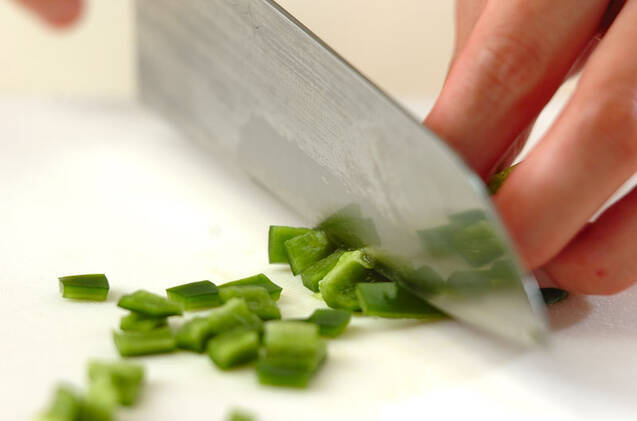 ピーマンは縦半分に切ってヘタと種を取り、5mm角に切る。