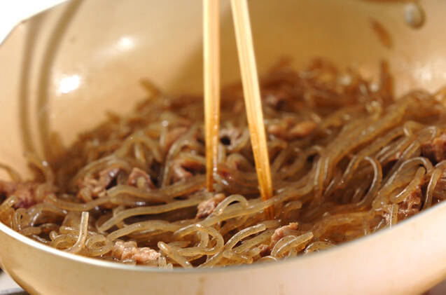 フライパンにゴマ油を中火で熱し、牛肉をほぐしながら炒める。色が変わってきたら、糸コンニャクを加えて炒め合わせる。