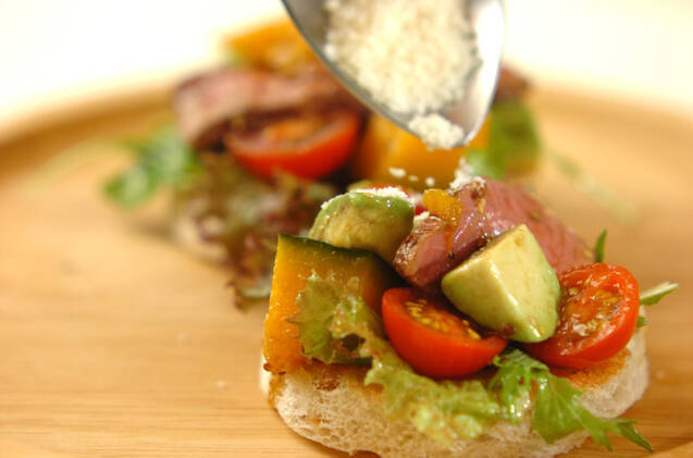 ライ麦パンにベビーリーフと(1)をのせ、粉チーズを振る。