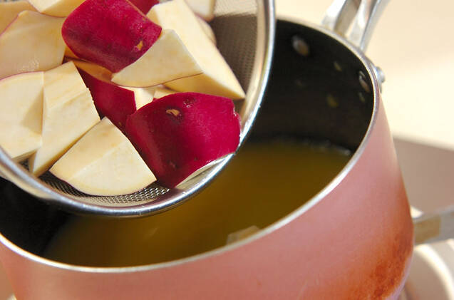 鍋に水気をきったサツマイモ、オレンジジュース、レモン汁、砂糖、ハチミツを加え、蓋をして強火にかける。