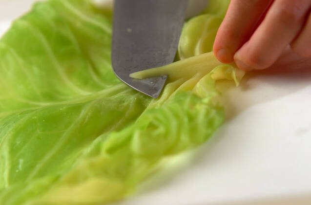 キャベツは芯をくり抜き、流水に当てながら1枚ずつはがし、熱湯に入れてゆでる。ザルに引き上げ、冷めたら軸のかたい部分を削ぎ切り、軸は細かく刻む。