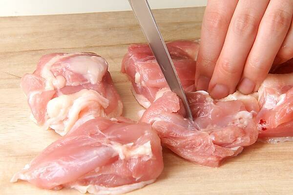 鶏もも肉は1枚を6~8つに切り、身の厚い部分は包丁の先で切り込みを入れ、塩コショウをからめる。