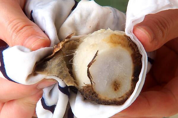 里芋は皮ごとたわしできれいに水洗いし、根元側を少し切り落とし、タップリの水、酒と共に鍋に入れて強火にかけ、煮立てば火を少し弱め、竹串がス~ッと刺さるくらいまでゆでる。ザルに上げ、布巾等に包んで皮をむく。大きい物は食べやすい大きさに切る。